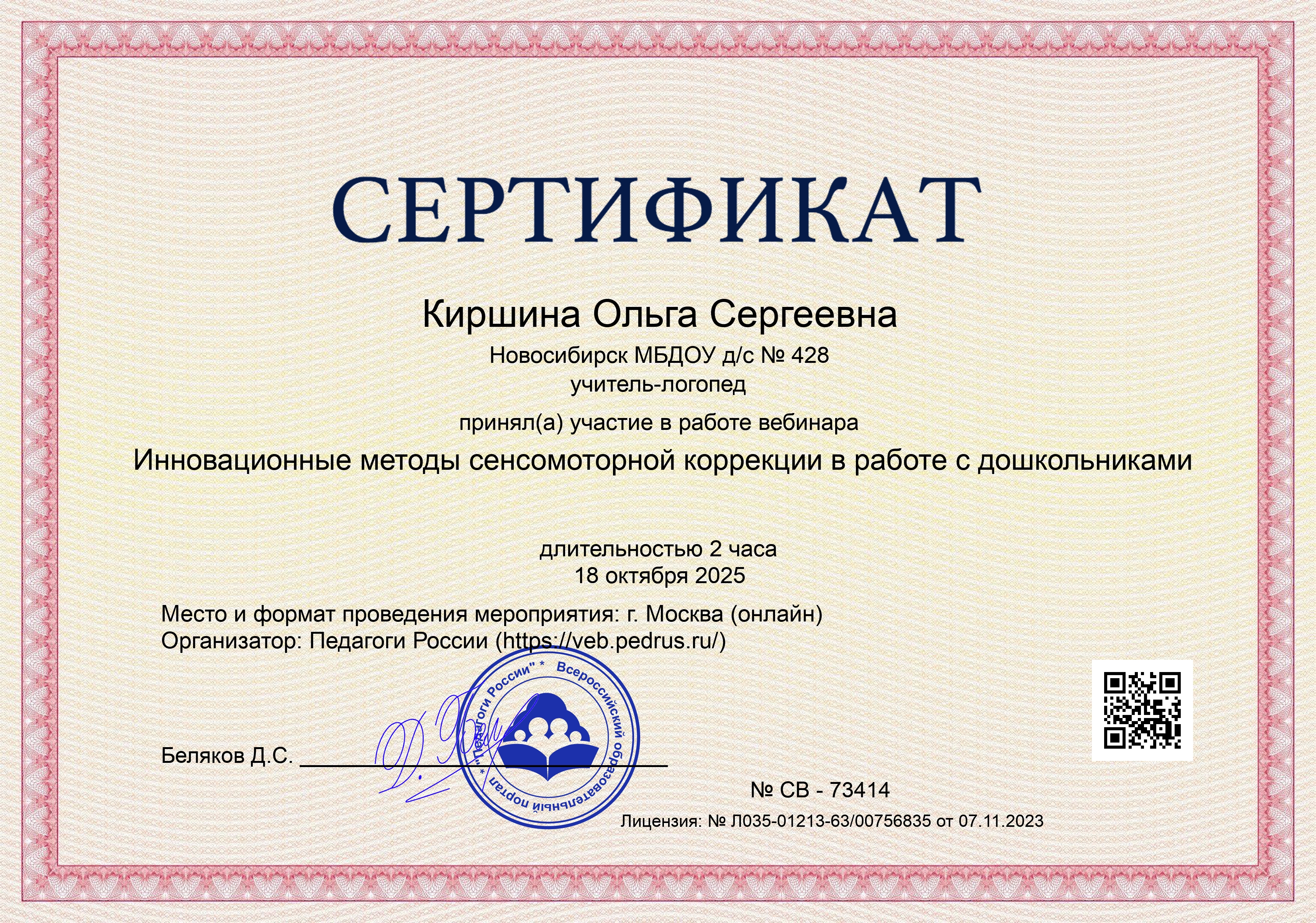 Сертификат вебинара "Инновационные методы сенсомоторной коррекции в работе с дошкольниками"